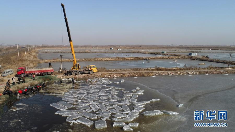 1月29日,河北省唐山市滦南县东黄坨镇西玉坨村一鱼池,工人在出鱼(无人机照片)。新华社发(张永新 摄)