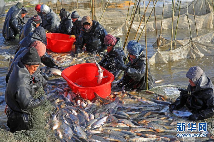 1月29日,河北省唐山市滦南县东黄坨镇西玉坨村一鱼池,工人在出鱼。新华社发(张永新 摄)