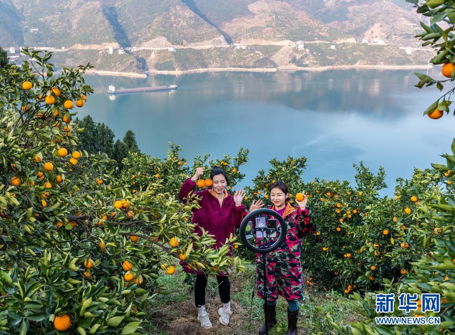 1月28日,秭归县电商主播在秭归县沙镇溪镇树坪村脐橙园里直播推介脐橙,帮助果农销售。