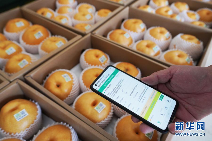 1月28日,在邹平市长山镇八方农场,农业部门工作人员扫描梨上的合格证二维码,查验产品信息。新华社发(董乃德 摄)