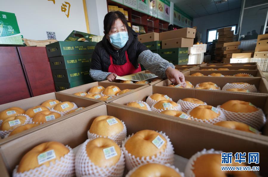 1月28日,邹平市长山镇八方农场农民在梨上粘贴合格证二维码,准备对外销售。新华社发(董乃德 摄)