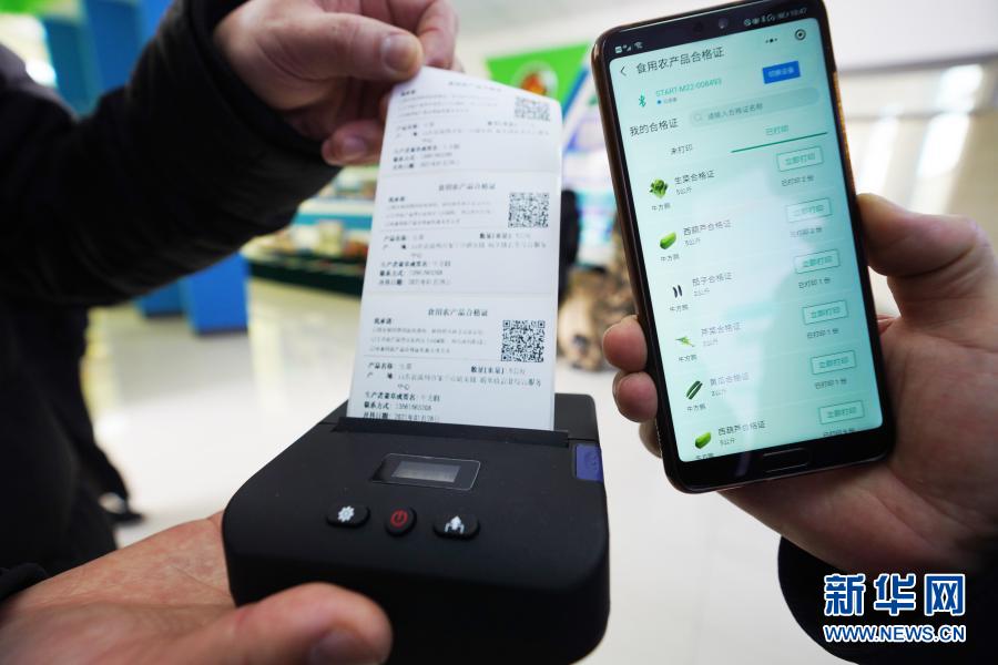 1月28日,邹平市明集镇农民合作社的农民打印自产农产品的合格证二维码。新华社发(董乃德 摄)