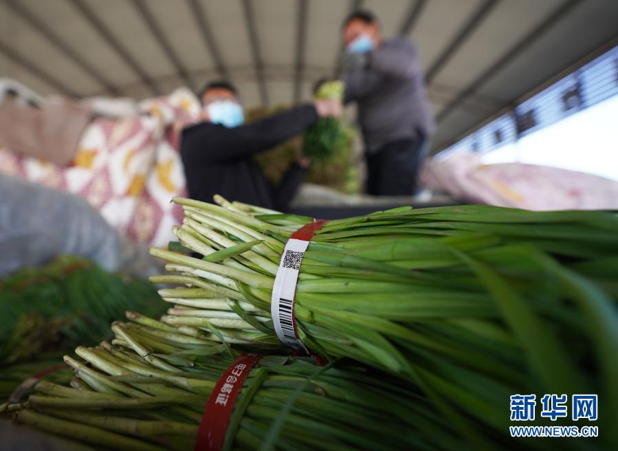 在邹平市码头镇李坡村市场,韭菜捆扎条上印有合格证二维码(1月29日摄)。新华社发(董乃德 摄)