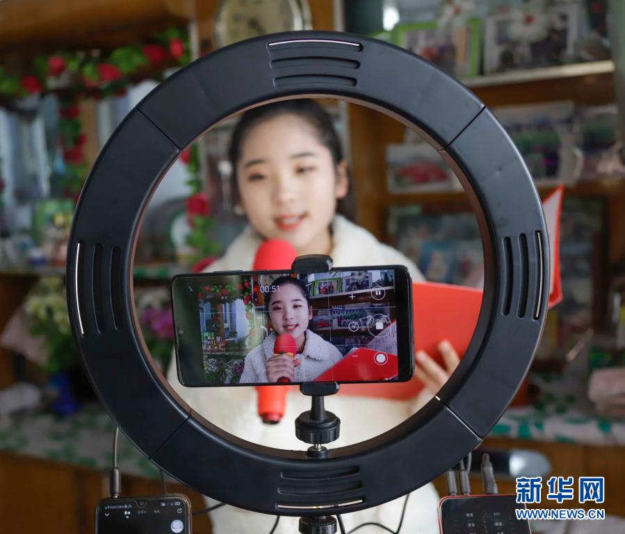 1月29日,遵化市兴旺寨乡花椒园村村民在录制诗歌朗诵视频。