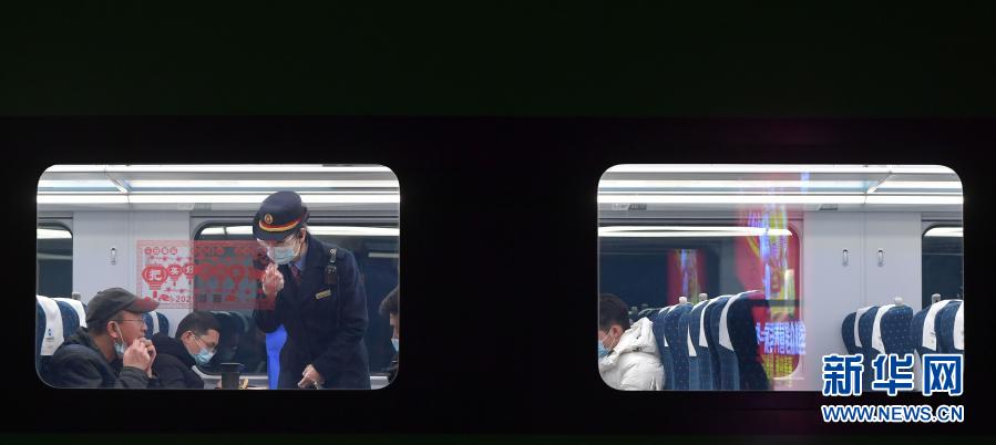 在中国铁路南昌局集团有限公司南昌客运段的一趟列车上,乘务员王阿静在车厢内巡查,提醒旅客戴好口罩(1月26日摄)。新华社记者 彭昭之 摄