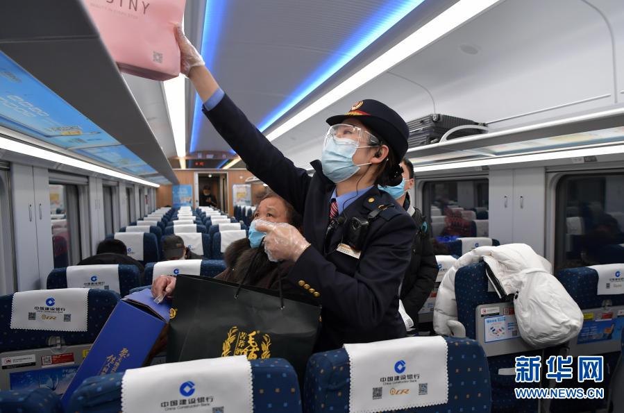 在中国铁路南昌局集团有限公司南昌客运段的一趟列车上,乘务员王阿静在帮旅客摆放行李(1月26日摄)。新华社记者 彭昭之 摄