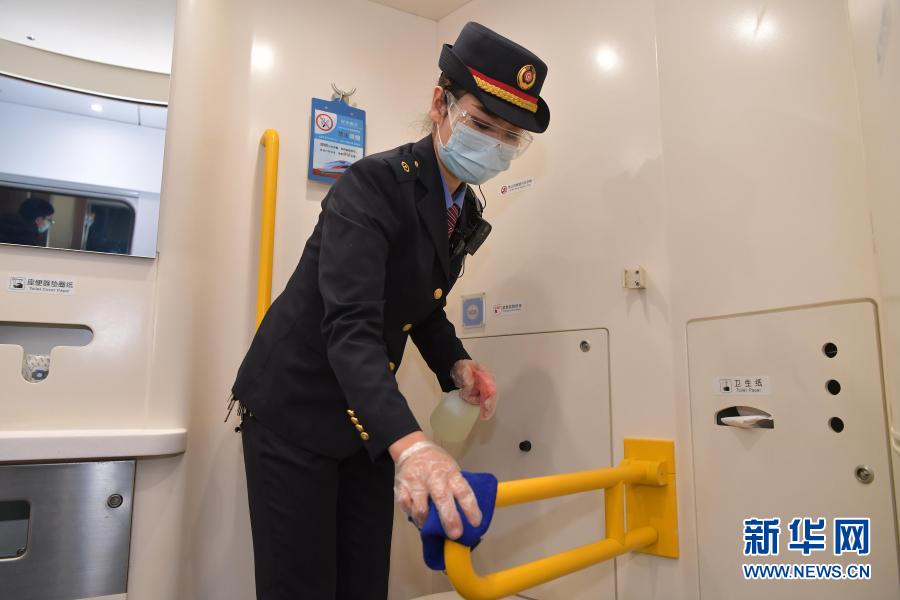 在中国铁路南昌局集团有限公司南昌客运段的一趟列车上,乘务员王阿静在车厢内进行清洁消毒作业(1月26日摄)。新华社记者 彭昭之 摄