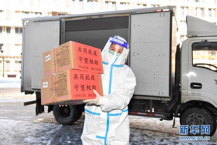 1月30日,在通化市医护人员驻地,工作人员将生活物资搬运至驻地大堂。新华社记者 许畅 摄