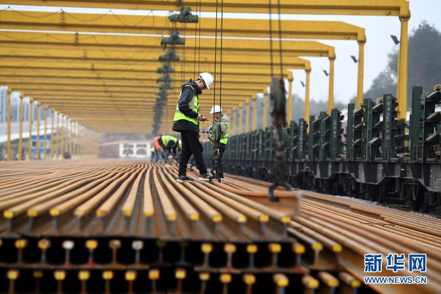 1月30日,在中铁十七局安九高铁安庆铺轨基地,工作人员进行卸轨作业。