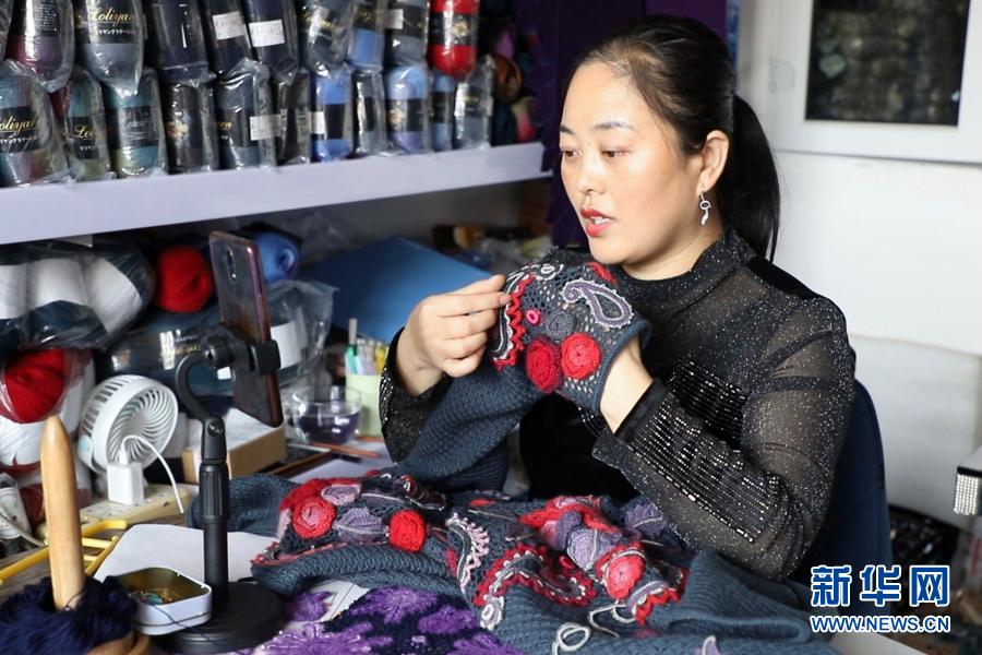 黑龙江省鹤岗市绥滨县忠仁镇黎明村村民李明鸽在家里直播售卖手工编织产品(2020年10月29日摄)。新华社记者 徐凯鑫 摄