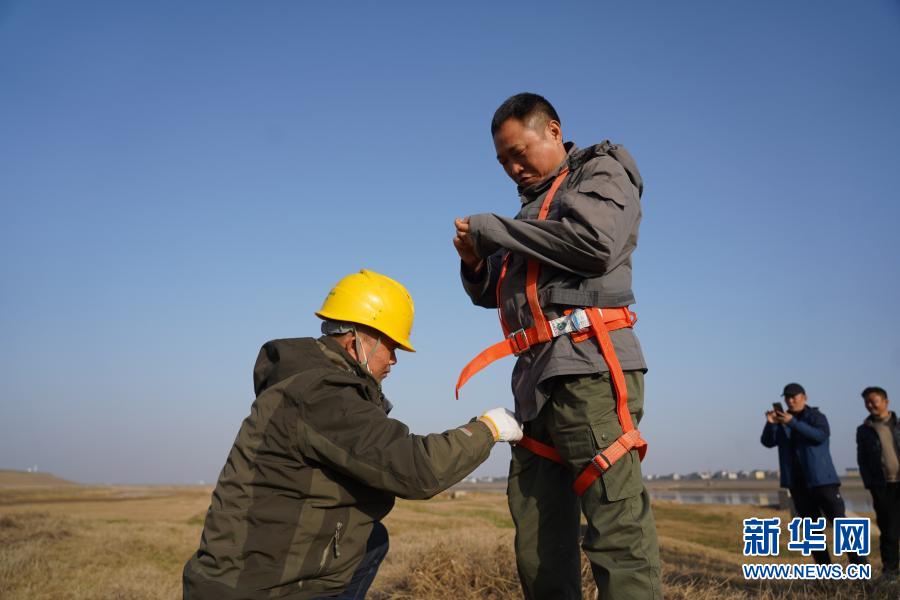 在鄱阳县饶丰镇,工作人员穿戴装备准备上塔(1月29日摄)。