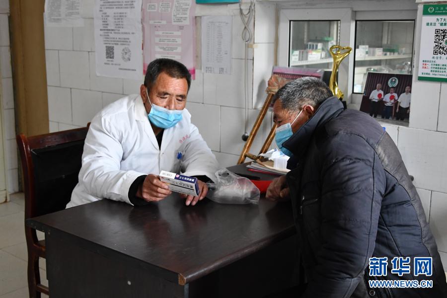 1月29日,在邵原镇称弯村,许奎民为患者详细讲解用药说明。新华社发