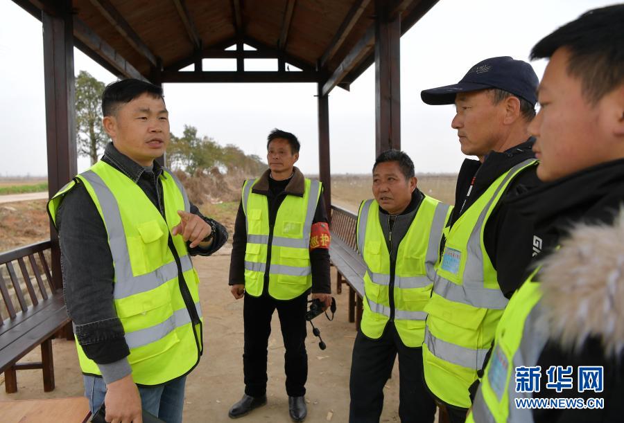 1月30日,在鄱阳湖畔的江西省余干县康山垦殖场,雷小勇(左一)在和候鸟巡护队队员一起商讨当日的巡护路线。新华社记者 彭昭之 摄