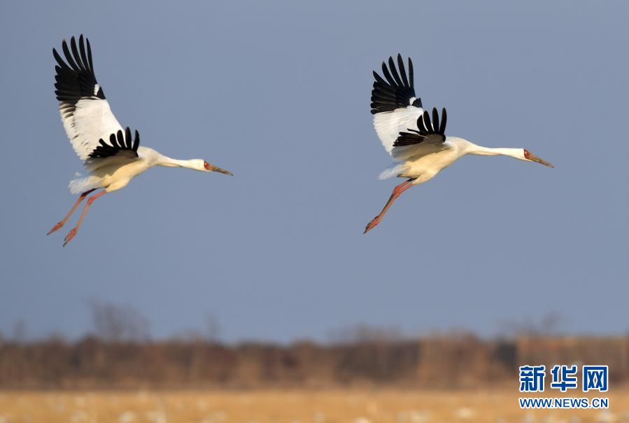 在江西省余干县康山垦殖场,白鹤即将降落在稻田里(1月15日摄)。新华社记者 彭昭之 摄