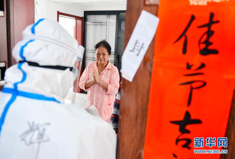 1月31日,在吉林省通化市东昌区一小区,居民向入户进行核酸采样的医务人员表示感谢。