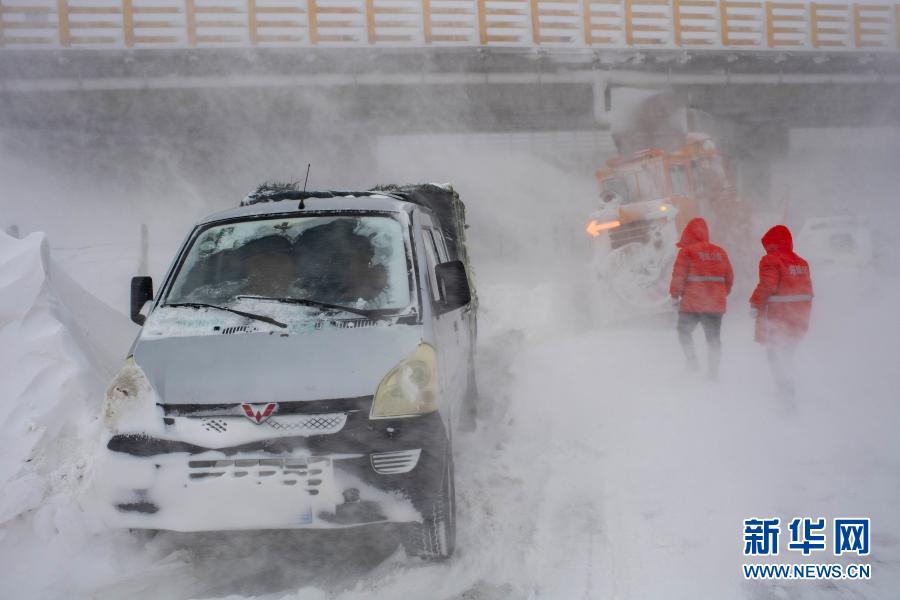 玛依塔斯防风雪抢险基地的工作人员顶风冒雪搜寻被困旅客(1月23日摄)。