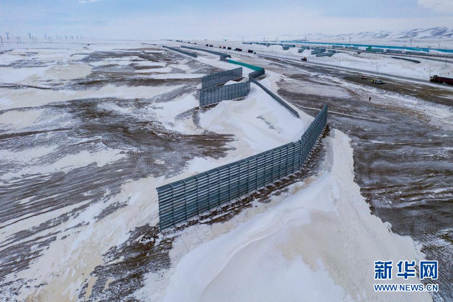 穿行玛依塔斯风区的车辆行驶在经过清雪作业后的S201线上,路旁设有成排的挡雪板、防雪网(1月22日摄,无人机照片)。
