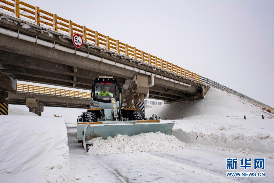 玛依塔斯防风雪抢险基地的工作人员进行清雪作业(1月24日摄)。
