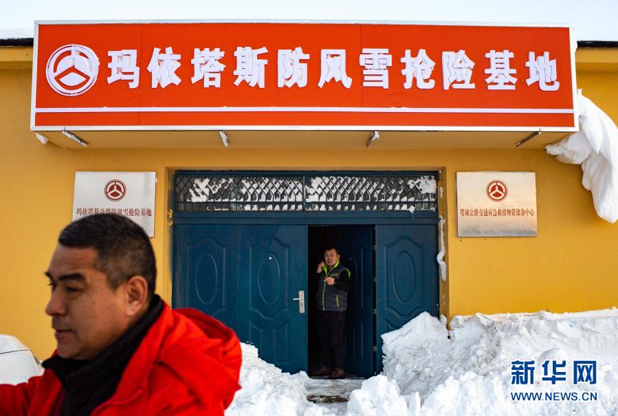 玛依塔斯防风雪抢险基地的工作人员即将出发巡道,巴图散(后)急忙跟着到门口叮嘱同事注意安全(1月24日摄)。