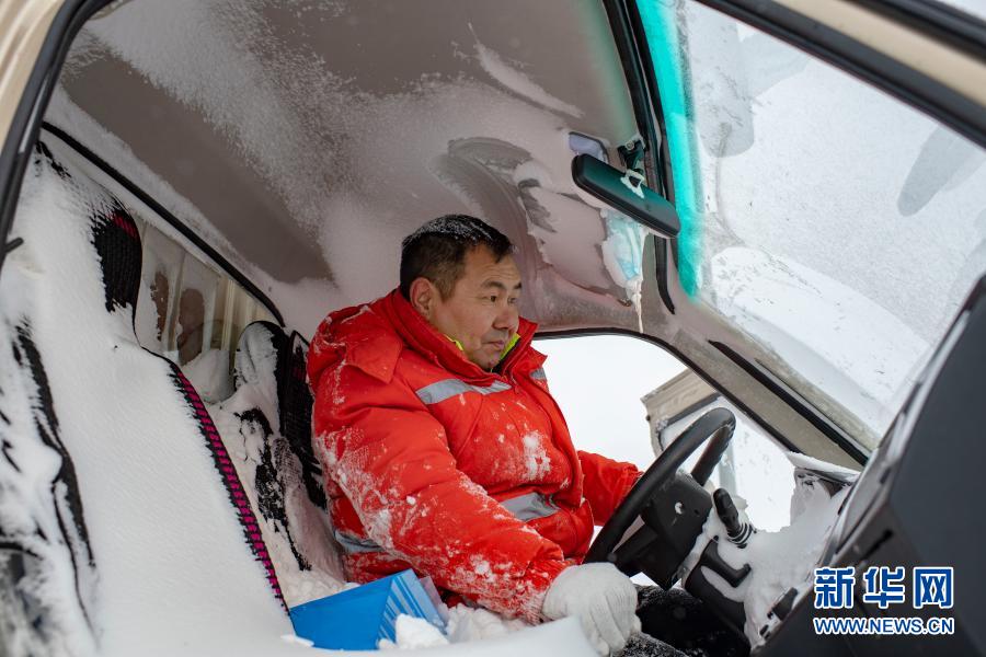 玛依塔斯防风雪抢险基地的工作人员巴图散调试被困车辆,准备将其拖移到安全地带(1月24日摄)。
