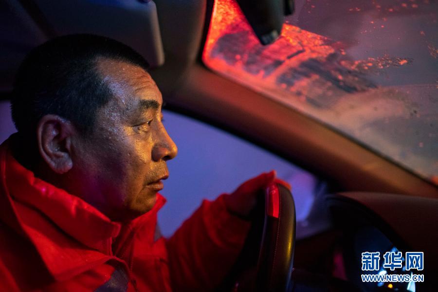 凌晨4点11分,玛依塔斯防风雪抢险基地的工作人员曹玉亮全神贯注盯着前方路况,转运受困旅客(1月23日摄)。