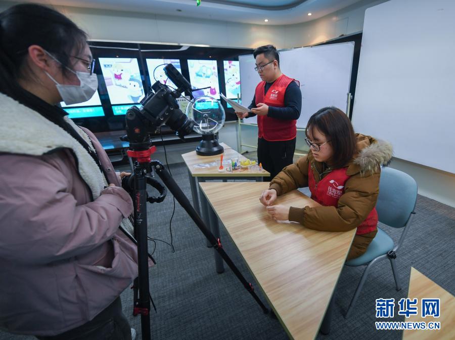 1月30日,志愿者在录制“星星点灯”科普云课堂的科学小实验。