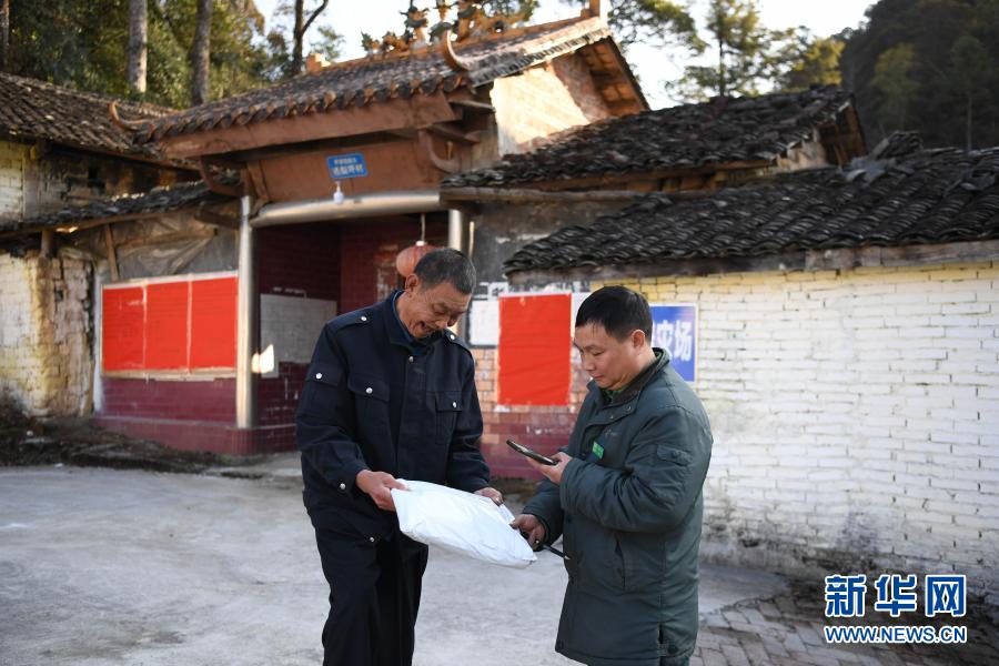 1月29日,在广东阳山秤架瑶族乡橏梨坪村,黄世华(右)把邮件送到村民手中。