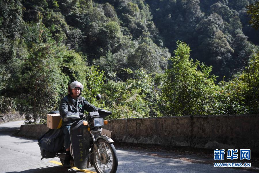 1月29日,在广东阳山秤架瑶族乡,黄世华骑着摩托行驶在山间邮路上。