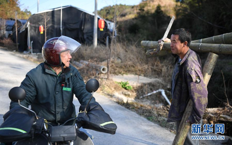 1月29日,在广东阳山秤架瑶族乡橏梨坪村,黄世华(左)在送邮件的途中路遇熟悉的村民,攀谈起来。