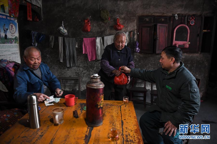 1月29日,在广东阳山秤架瑶族乡橏梨坪村,黄世华(右)把义务帮忙代购的猪肉送到王金彪(左)家中后,老人忙着数钱给他。