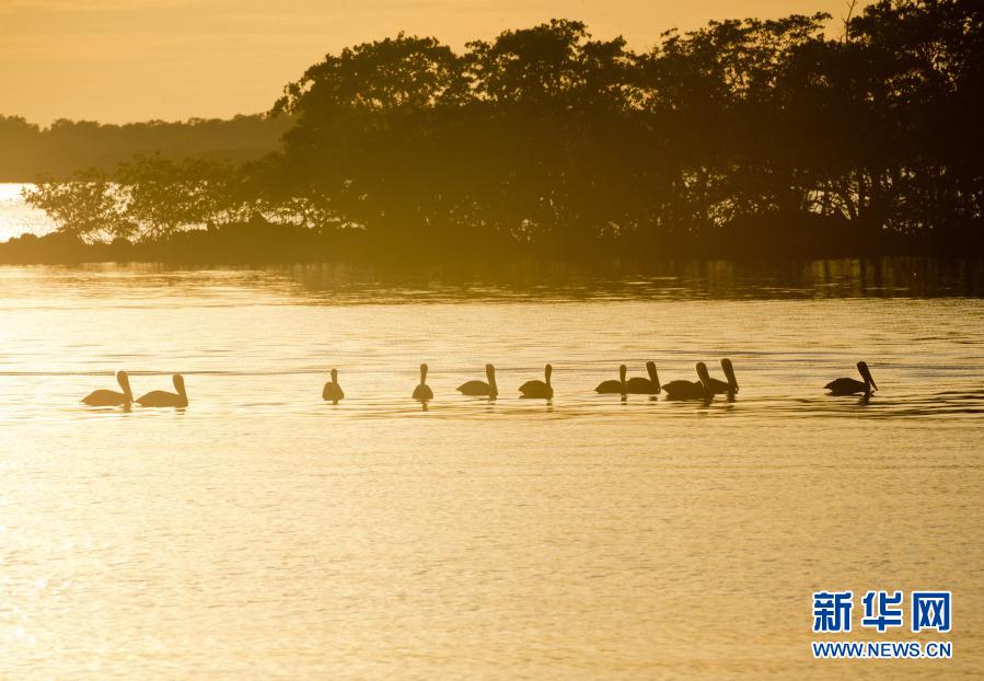 鹈鹕在日落时分的美国佛罗里达大沼泽地国家公园游弋(2013年10月27日摄)。