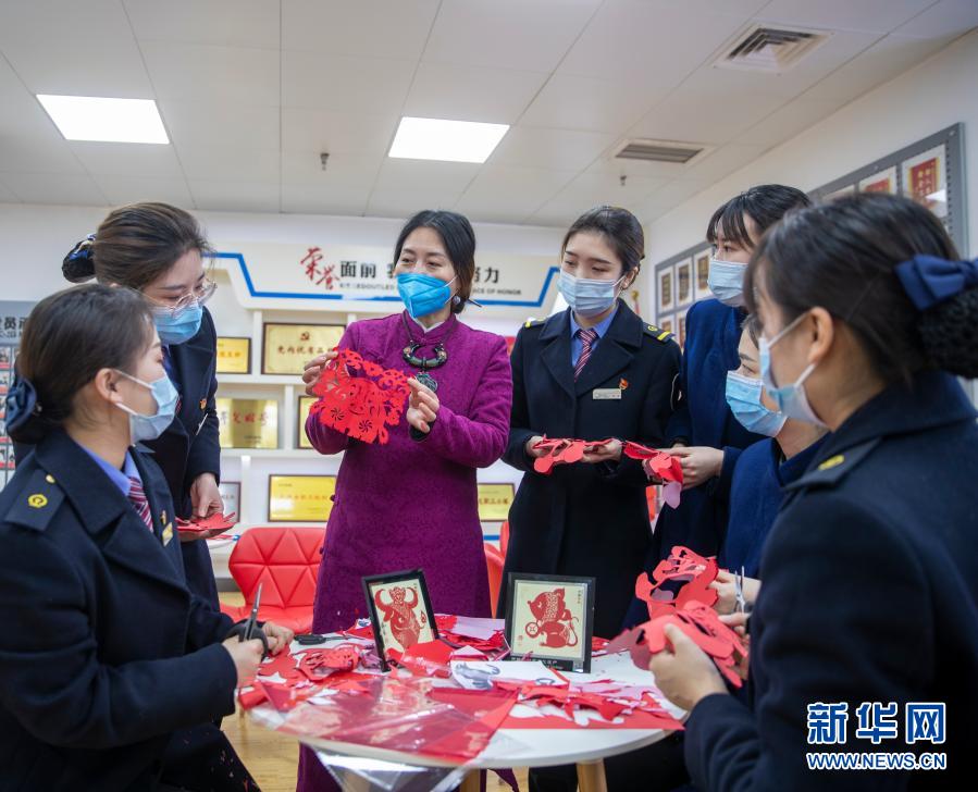 2月1日,在重庆北车站,重庆市非遗剪纸项目代表性传承人杨玲(左三)为中国铁路成都局集团有限公司重庆车站的青年员工讲解剪出牛年生肖窗花的注意细节。