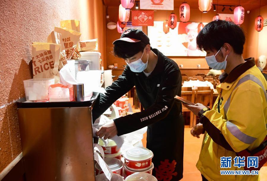 2月1日,在一家位于福州市台江区的餐厅,餐饮服务从业人员和美团快递送餐人员佩戴口罩上岗。