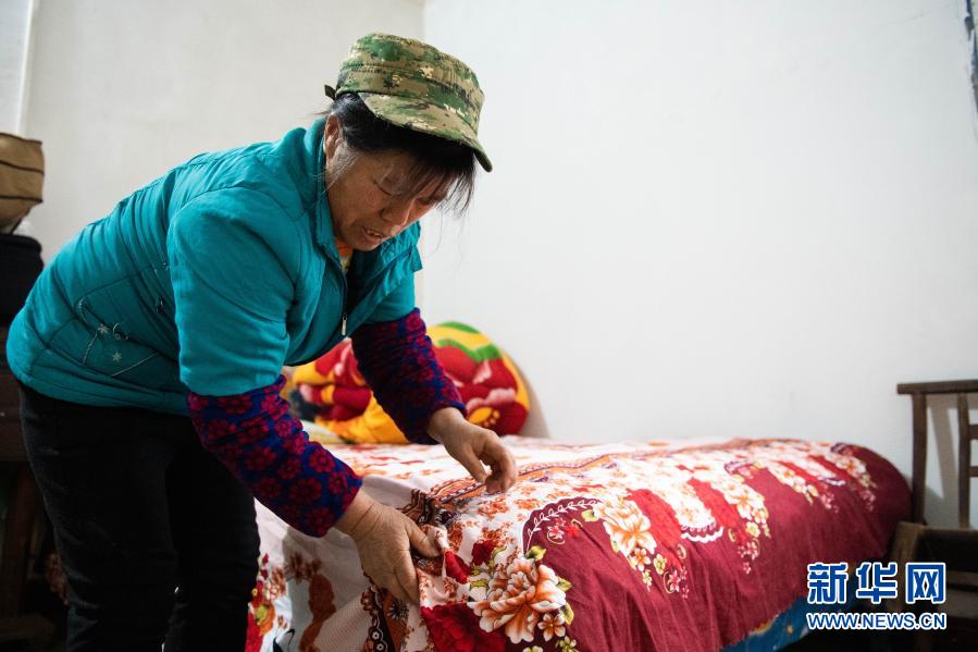 1月29日,在湖南省泸溪县浦市镇麻溪口村,杨玉英为儿子整理被褥。