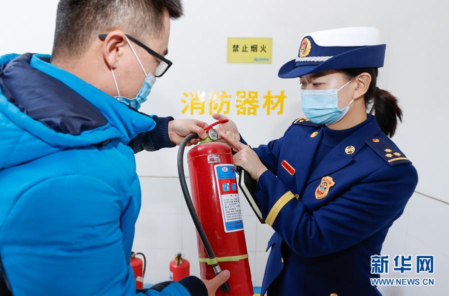 2月1日,消防监督检查人员在购物商场内对灭火器压力进行检查。