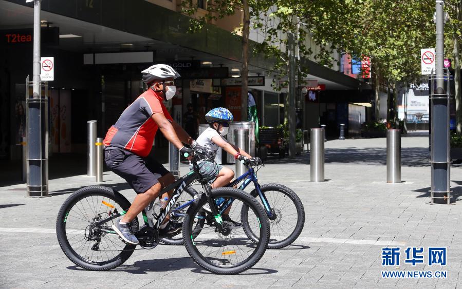2月1日,骑行者在澳大利亚珀斯戴口罩出行。新华社发 (周丹 摄)