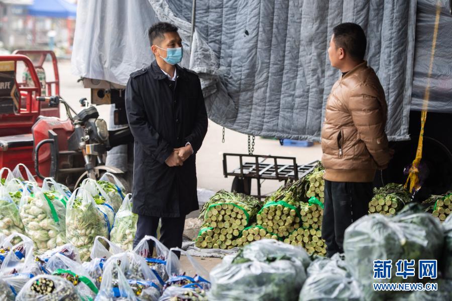 1月24日,叶锋(左)和商户在长沙大河西农产品物流中心交流。
