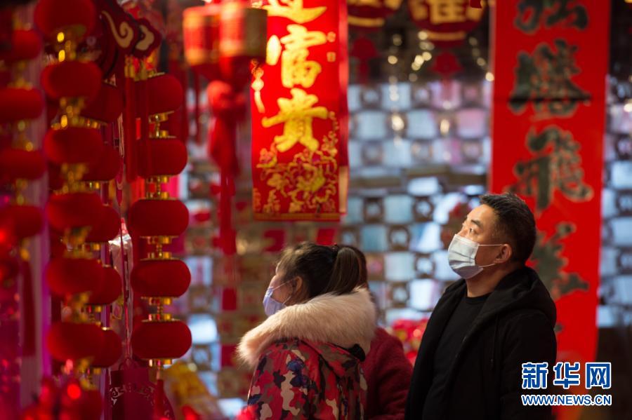 2月1日,市民在西安义乌小商品批发市场挑选节庆饰品。