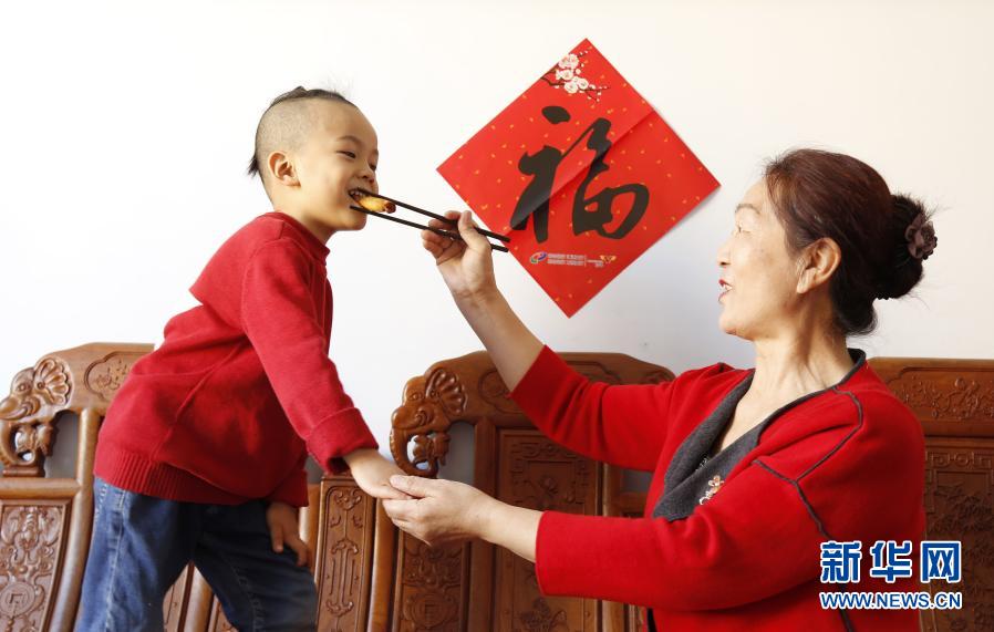 2月2日,河北省襄都区西大街街道申家庄社区儿童在家吃春饺“咬春”。
