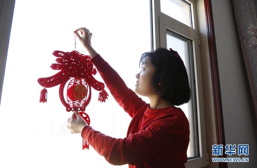 2月2日,河北省襄都区西大街街道申家庄社区学生挂“春”字灯笼。