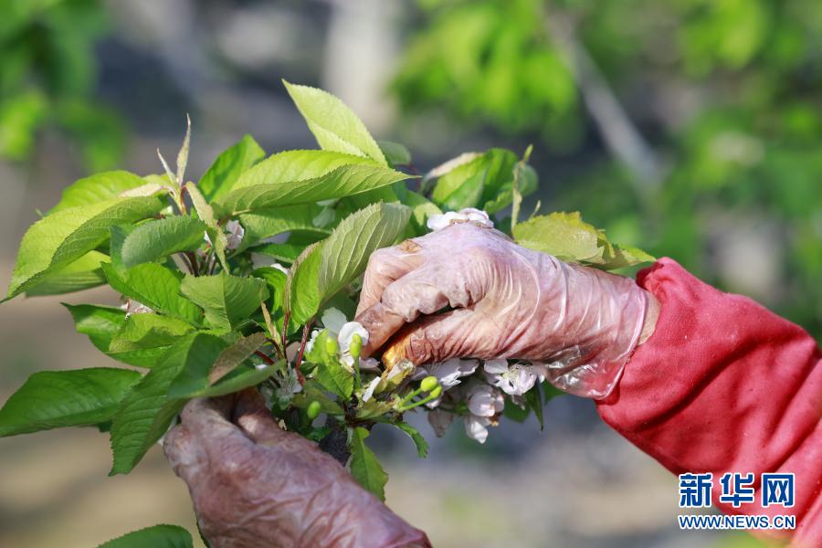 2月2日,河北省唐山市丰南区钱营镇小张各庄村的果农在陶梓艺生态农业园区大棚内对樱桃进行疏花。