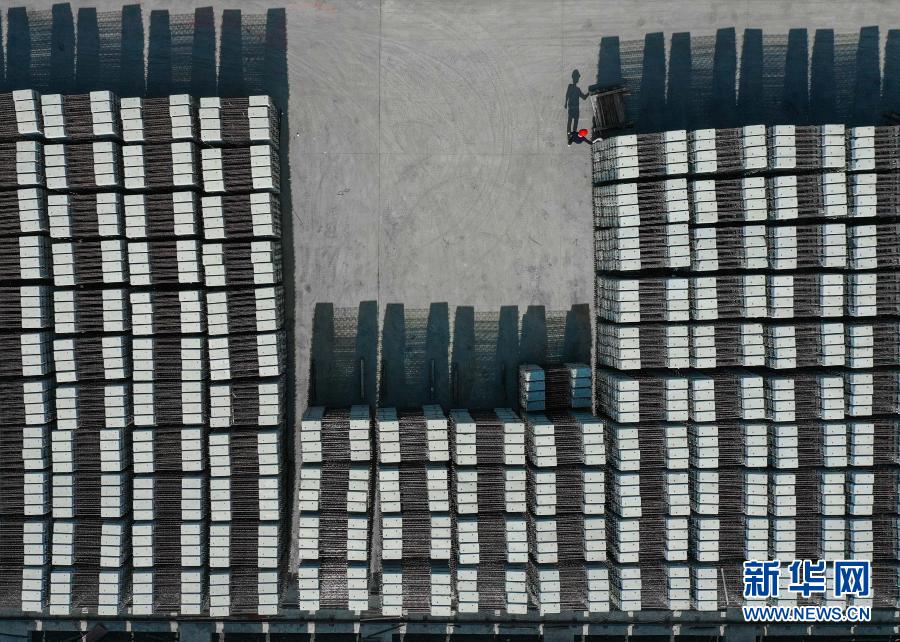 2月2日,中铁建华南建设(广州)建材有限公司混凝土制品厂管理人员检查混凝土轨枕库存(无人机照片)。