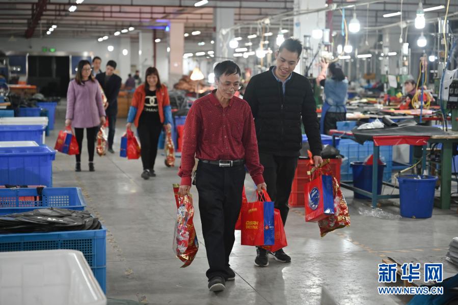 2月1日,在福建省福州市闽侯县的亿格户外用品有限公司生产车间,四川籍计件工人张良国(前左)和工友提着年货准备下班。新华社记者 宋为伟 摄