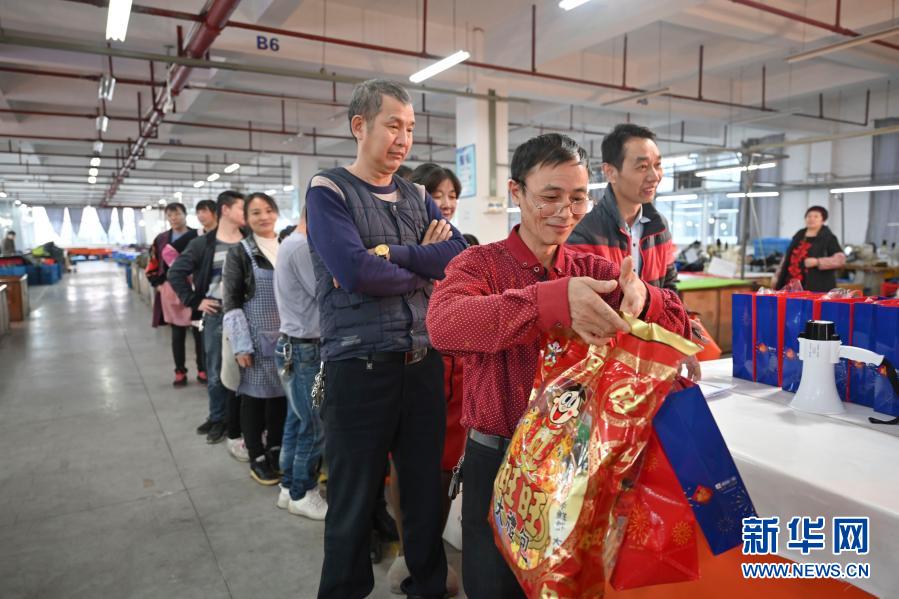 2月1日,在福建省福州市闽侯县的亿格户外用品有限公司生产车间,四川籍计件工人张良国领到企业发放的年货。新华社记者 宋为伟 摄