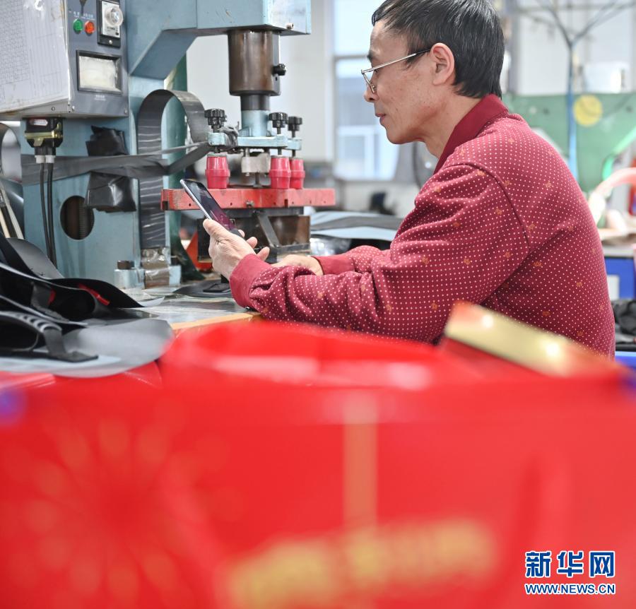 2月1日,在福建省福州市闽侯县的亿格户外用品有限公司生产车间,四川籍计件工人张良国在领到年货后与远在家乡的小儿子视频通话。新华社记者 宋为伟 摄