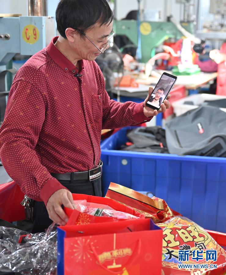 2月1日,在福建省福州市闽侯县的亿格户外用品有限公司生产车间,四川籍计件工人张良国与远在家乡的小儿子视频通话,展示领到的年货。新华社记者 宋为伟 摄
