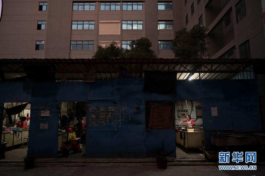 1月26日,在福建省石狮市的金利莱斯服装厂,黄海龙的妻子黄爱华(右)在厨房做饭,其他工友也在一旁做饭。