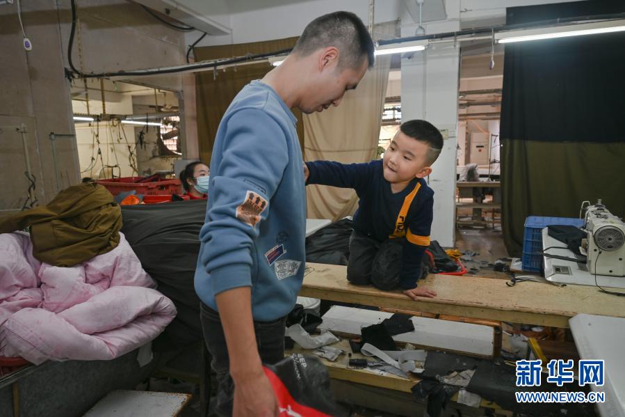 1月26日,在福建省石狮市的金利莱斯服装厂,聪聪帮黄海龙拍掉粘在衣服上的棉絮。