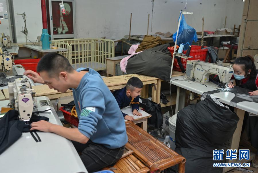 1月26日,在福建省石狮市的金利莱斯服装厂,黄海龙和妻子在为老家的亲人缝制枕头和袖套,聪聪在一旁玩耍。