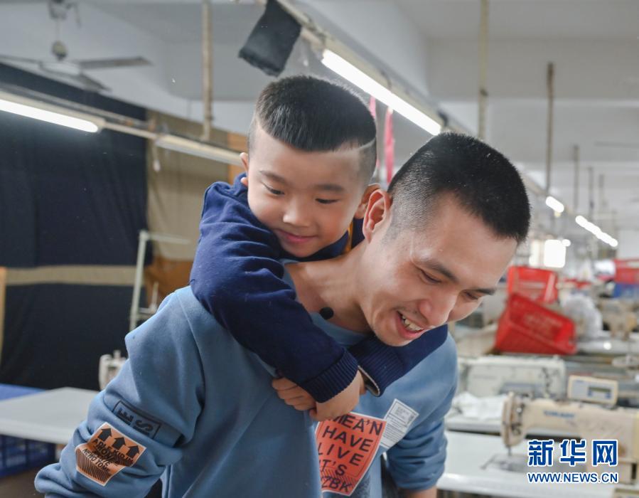 1月26日,在福建省石狮市的金利莱斯服装厂,聪聪和黄海龙在一起。